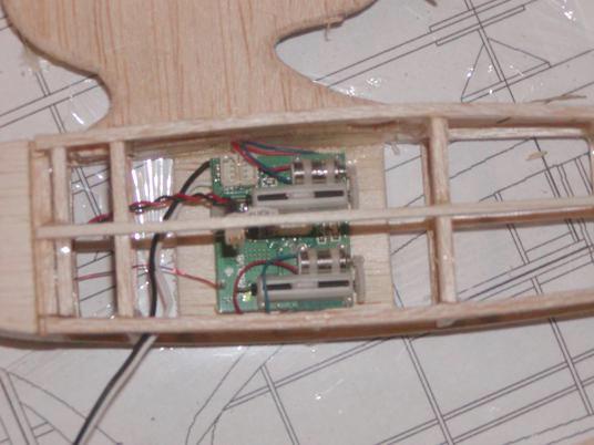 Session #2 May 30, 2010 Well it is a holiday weekend so I am off work and have a little time to further the build and a few other projects I am working on for the 2010 SAM Champs in September. Continuing.... In the last session I showed you the framed up fuselage and wing. How we will go on with the build. I am using the little Spektrum 2.4 6400L brick radio, which has the receiver, the ESC and two servos all built into one little brick module. The "L" denotes long throw servos. It is the same price as the standard throw version so I figured what the heck. I may need a little more throw...who knows Here you see the little brick laid on a piece of balsa I glued into the side of the fuselage. I will attach it with a piece of servo tape as there are no mounting holes, etc., on the unit..