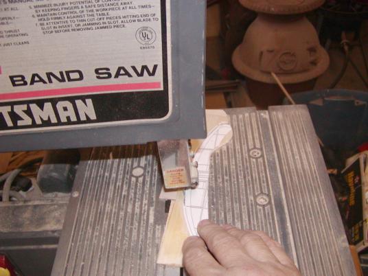 After tacking on the pattern, I took the wood to the bandsaw and proceeded to cut out the trailing edge.