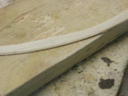 After sanding to shape, I removed the pattern and sanded it to the shape of a trailing edge. I held it against a wood block while sanding to prevent breaking the piece. Once tapered to shape, you can see the 1X32" wood starting to show at the thinnest part of the trailing edge.
