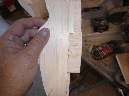 With the fuselage and wing roughed in i decided to start on the "tail feathers". I am not fond of building with very thin wood as I have a hard time handling it so when I saw that the trailing edge was thicker than 1X16"on the plans I decided to laminate some wood to build it out of. I took a piece of soft 1X16" balsa and glued a few pieces of some 1X32" crossgrain onto it. Here is the piece I eventually cut the trailing edge out of so you can see what I am talking about.